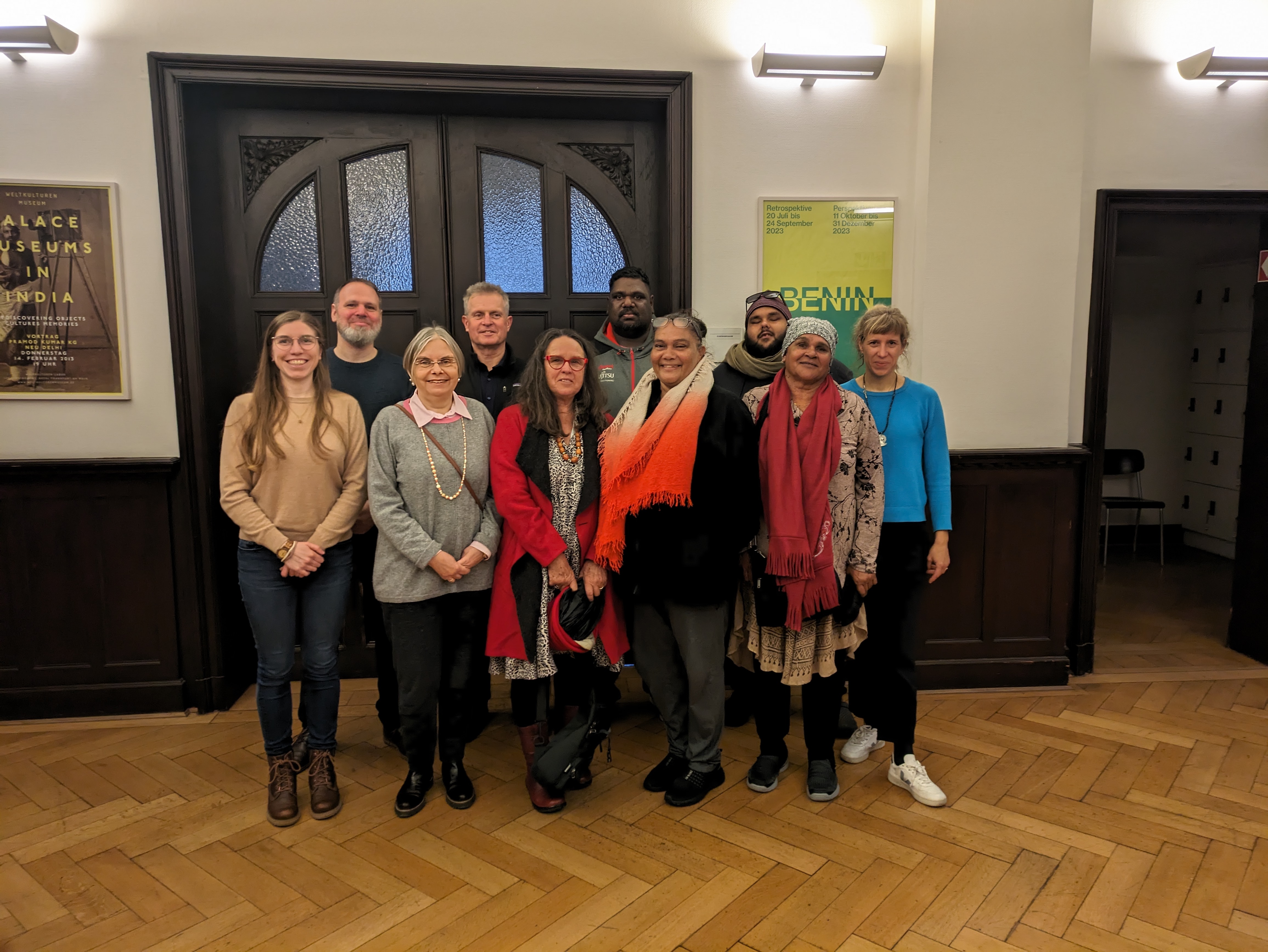 In preparation for the exhibition, the Traditional Owners Leah Umbagai and Pete O'Connor from the Dambimangari Aboriginal Corporation and Rona Charles and Lloyd Nulgit from the Wilinggin Aboriginal Corporation, accompanied by the Australian anthropologist Kim Doohan, were guests at the Weltkulturen Museum in autumn 2023. More information about the residency.