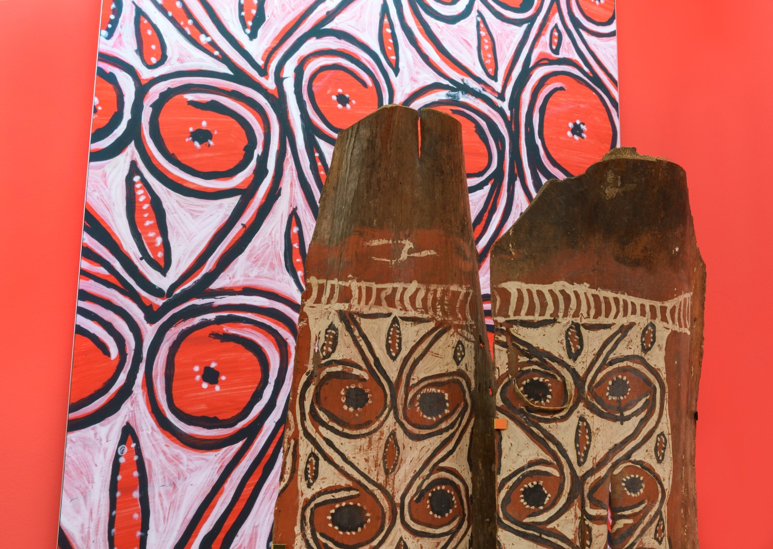 Mehrere dieser Werke sind derzeit in der Ausstellung „GRÜNER HIMMEL, BLAUES GRAS. Farben ordnen Welten.“ zu sehen – gemeinsam mit Sago-Palmblattmalereien aus der Sammlung des Weltkulturen Museums, die der Ethnologe Eike Haberland bereits 1961 in Avim sammelte. Diese Malereien auf Palmblattscheide dienten der Ausgestaltung des Männerhauses und sind eindrucksvolles Zeugnis einer Kunsttradition außerhalb einer europäischen Kunstgeschichte.