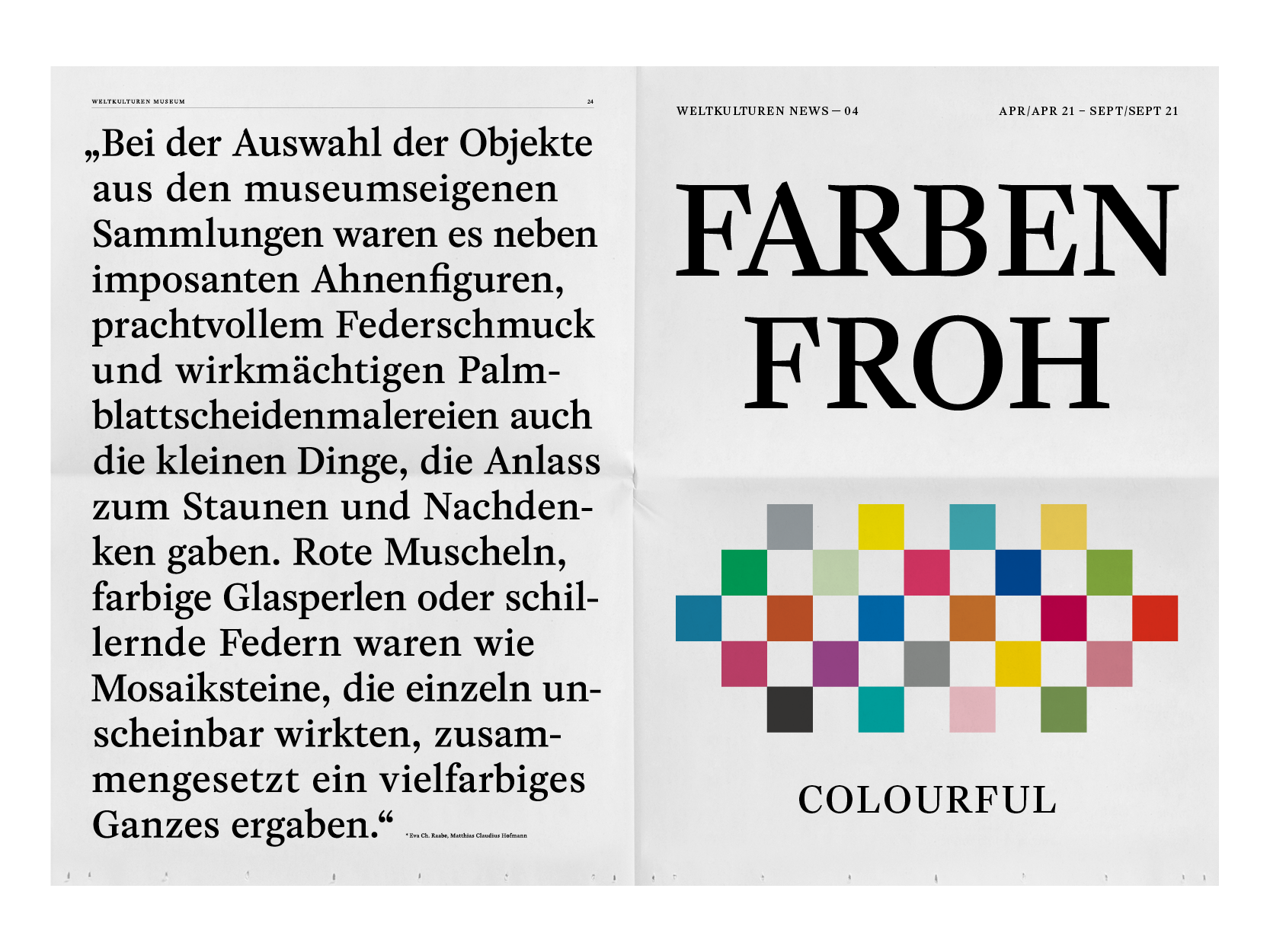 Ausstellungsansicht „Grüner Himmel, Blaues Gras. Farben ordnen Welten", Weltkulturen Museum 2021, Foto: Wolfgang Günzel