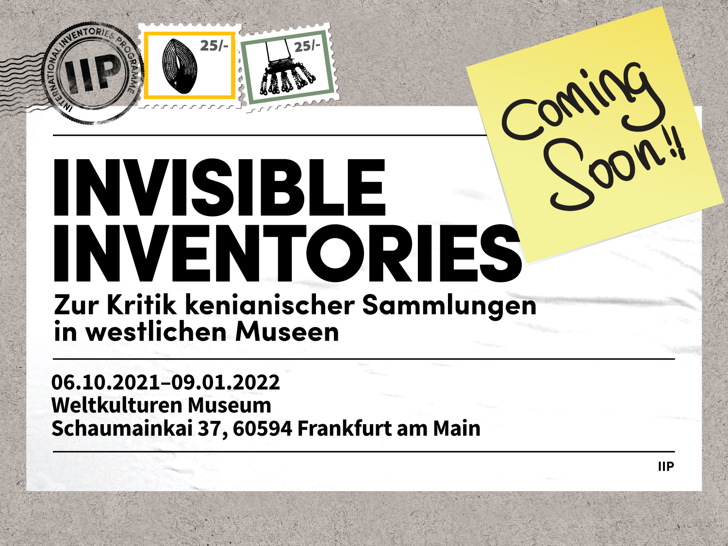 Mit diesem Anliegen beschäftigt sich seit 2018 das „International Inventories Programme" (IIP), das kenianische sowie europäische Künstler*innen und Wissenschaftler*innen zusammenbringt. Im Zentrum des Projektes steht die Entwicklung einer Datenbank aller kenianischen Objekte, die sich in den Museen Europas und Nordamerikas befinden. Nach vorangegangenen Ausstellungen in Nairobi (18.3.-30.5.2021) und Köln (28.5.-29.8.2021) wird die Visualisierung dieser Datenbank nun zusammen mit weiteren wissenschaftlichen und künstlerischen Beiträgen im Weltkulturen Museum gezeigt.