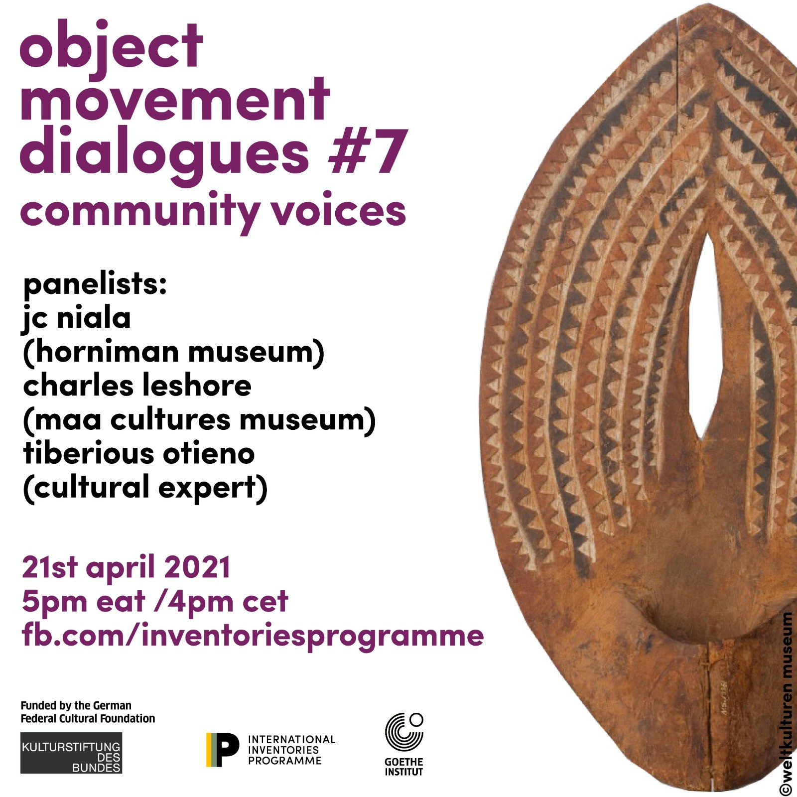 ∇ Live-Gespräch auf Facebook (@inventoriesprogramme) im Rahmen der Ausstellung „Invisible Inventories. Zur Kritik kenianischer Sammlungen in westlichen Museen“Δ Object Movement DialogueIm Rahmen der ersten „Invisible Inventories“ Ausstellung, die derzeit am kenianischen Nationalmuseum zu sehen ist, veranstaltet das International Inventories Programme (IIP) seinen siebten Object Movement Dialogue.