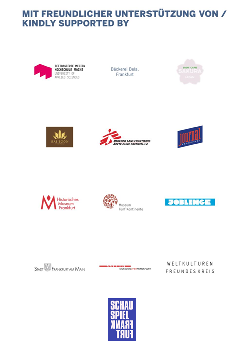 Adams Bodomo, Behrouz Boochani and Arash Kamali Sarvestani, Artist Collective Teru, Shahram Entekhabi, Edzard Herlyn and Thomas Hoeren, Junges Schauspiel Frankfurt, Karinding Keos, Phyllis Kiehl, Ella Knorz, Mansuela, Gora Mbengue, Yasemin Niephaus, José Oliveira, participants of the workshop „stories that matter“, Rajery and 3MA, Safransirup, Wiparat Sukatorn, Felix Schwarz, Takayuki Tamura, Daniel Traub with Wu Yong Fu and Zeng Xian Fang, Cliff Whitin
