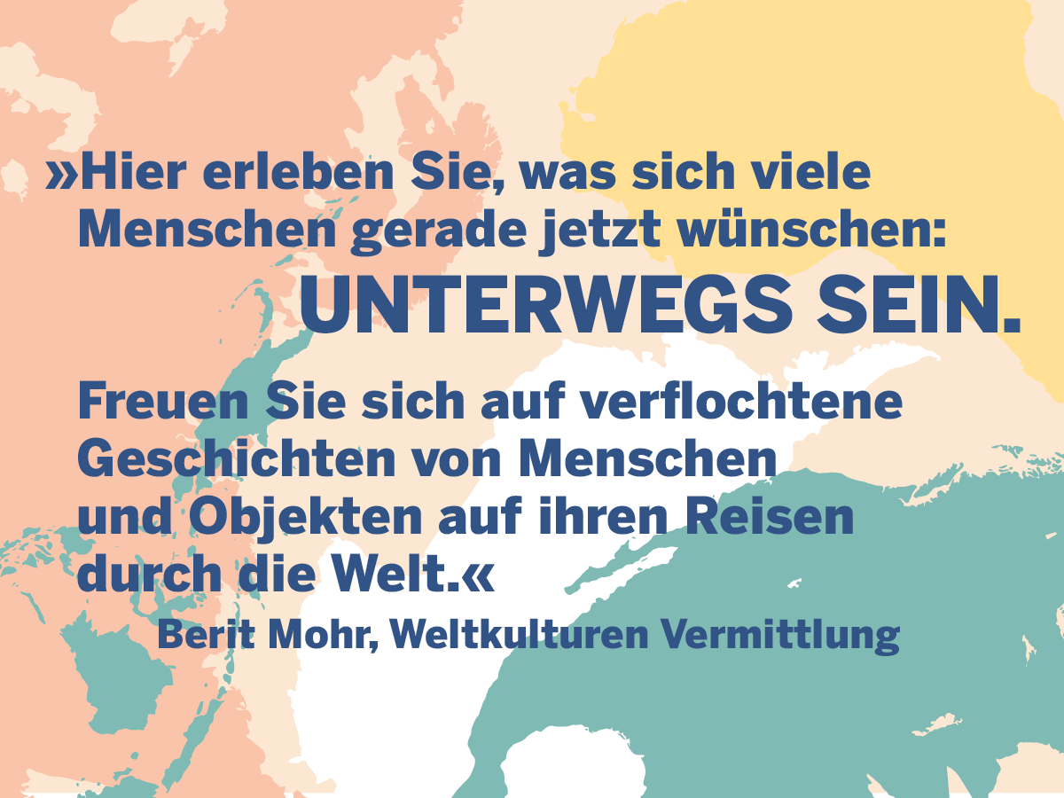 „… das erleben, was sich viele Menschen gerade jetzt wünschen: unterwegs sein. Freuen Sie sich auf verflochtene Geschichten von Menschen und Objekten auf ihren Reisen durch die Welt.“