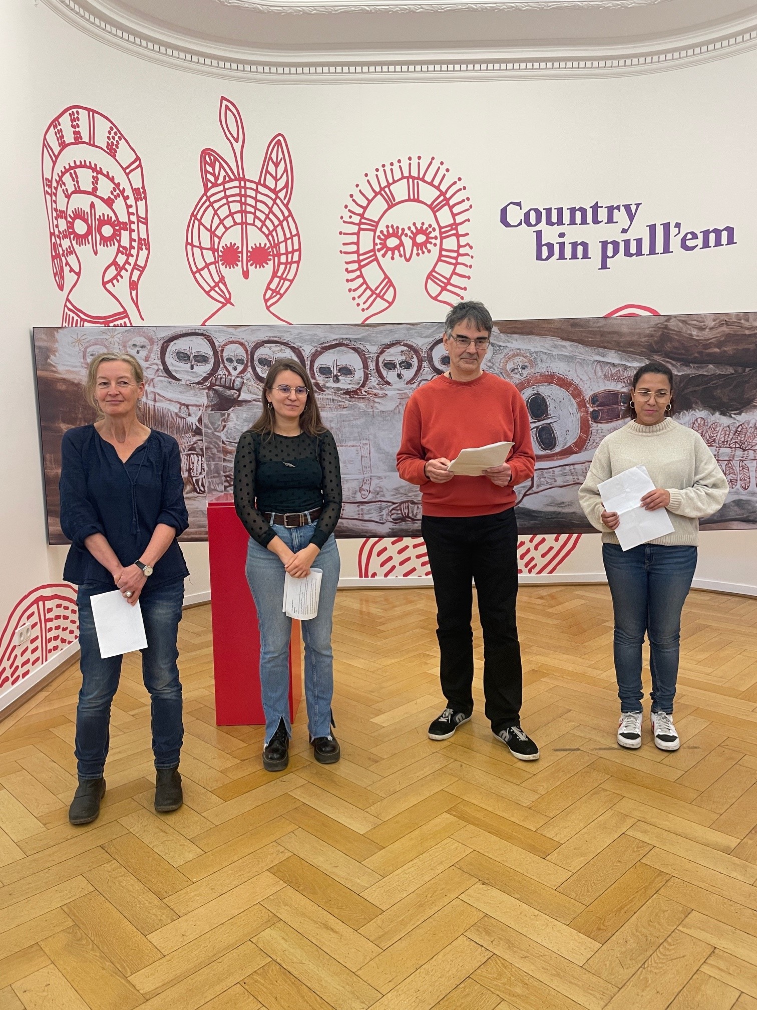 Nachdem wir uns in den zwei Workshops miteinander vertraut gemacht hatten, begann die konkrete Vorbereitungsphase unserer Führung. Najet, Marcel, Ute und ich trafen uns einmal pro Woche, um gemeinsam die aktuelle Australien-Ausstellung des Weltkulturen Museums zu besuchen. Dabei sammelten wir unsere Eindrücke und tauschten uns über die ausgestellten Werke und die großformatigen Kopien der Felsbilder aus.