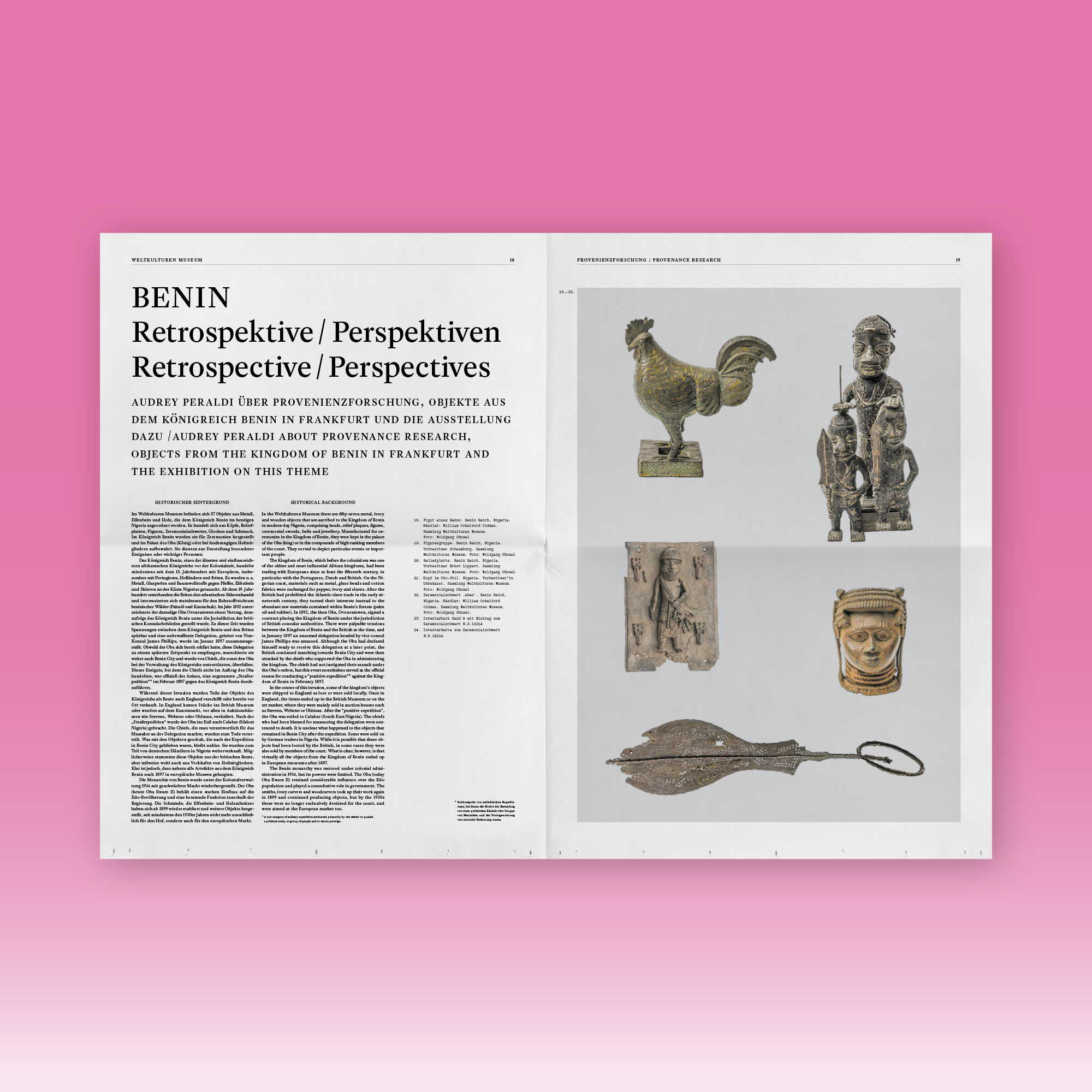 Audrey Peraldi (Kustodin Afrika) erzählt in einem Interview in den WELTKULTUREN NEWS #8 von der durchgeführten Provenienzforschung zu den Objekten aus dem Königreich Benin (Nigeria), die sich in der Sammlung des Weltkulturen Museums befinden. Außerdem berichtet sie von der Ausstellung "Benin. Die Sammlung im Weltkulturen Museum. Retrospektive/Perspektiven", die auf den Ergebnissen des Forschungsprojets aufbaut.