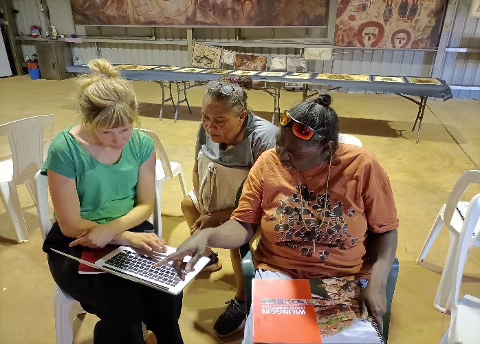Christina Henneke, Leah Umbagai und Kirsty Burgu diskutieren über die Archivdatenbank. Foto: Kim Doohan