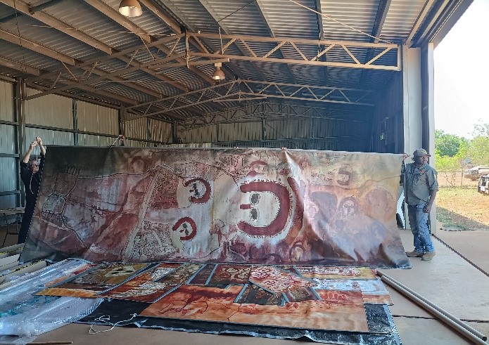Richard Kuba und Kane Nenowatt beim Aufhängen eines großformatigen Drucks einer Felszeichnung.