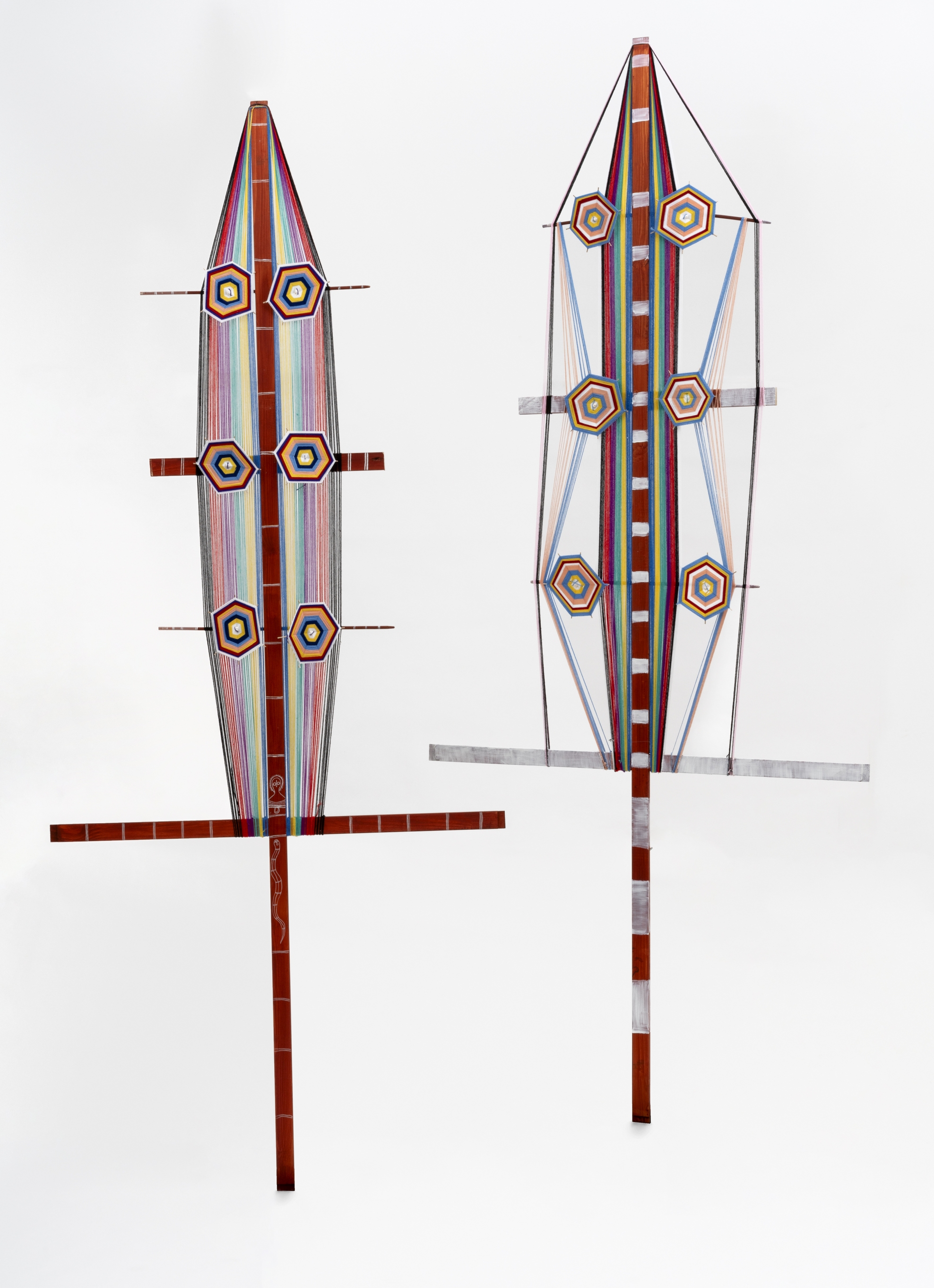 Lloyd Nulgit(links) und Pete O’Connor (rechts), Totem-Fadenkreuze, 2023, genehmigt durch Wilinggin und Dambimangari Aboriginal Corporations, Sammlung Weltkulturen Museum. Foto: Wolfgang Günzel