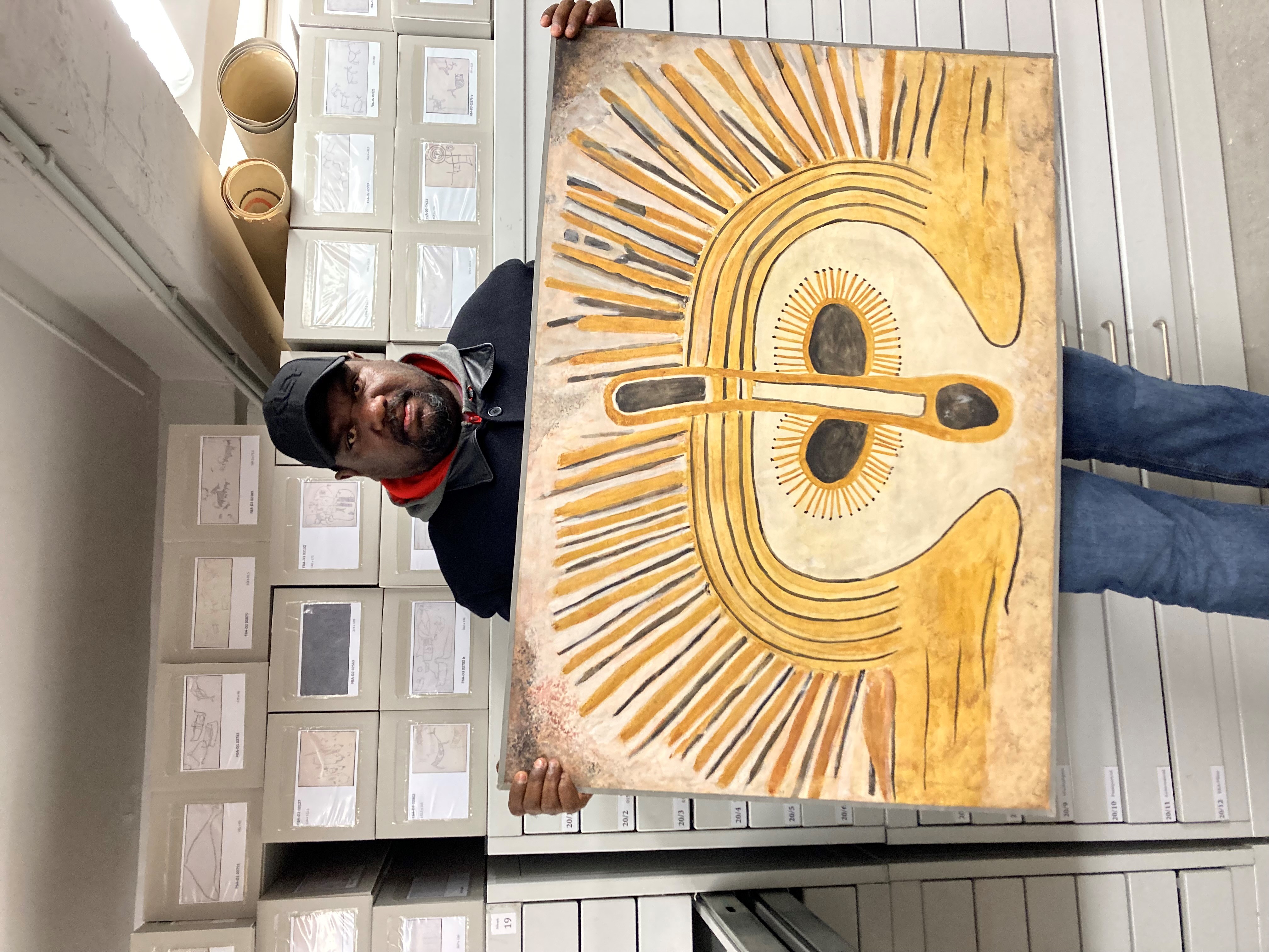 In preparation for the exhibition 'Country bin pull'em' at the Weltkulturen Museum from November 2024, they worked with Richard Kuba and Christina Henneke from the Frobenius Institute, Matthias Claudius Hofmann (Curator Oceania) and Isabel Kreuder (Research Assistant Oceania) on the collections of the 1938 Frobenius expedition. The group visited the archives and depots in Frankfurt. They discussed the significance and structure of archive materials and collections, such as the rock art copies, portraits and photographs held at the Frobenius Institute and the material culture objects at the Weltkulturen Museum.