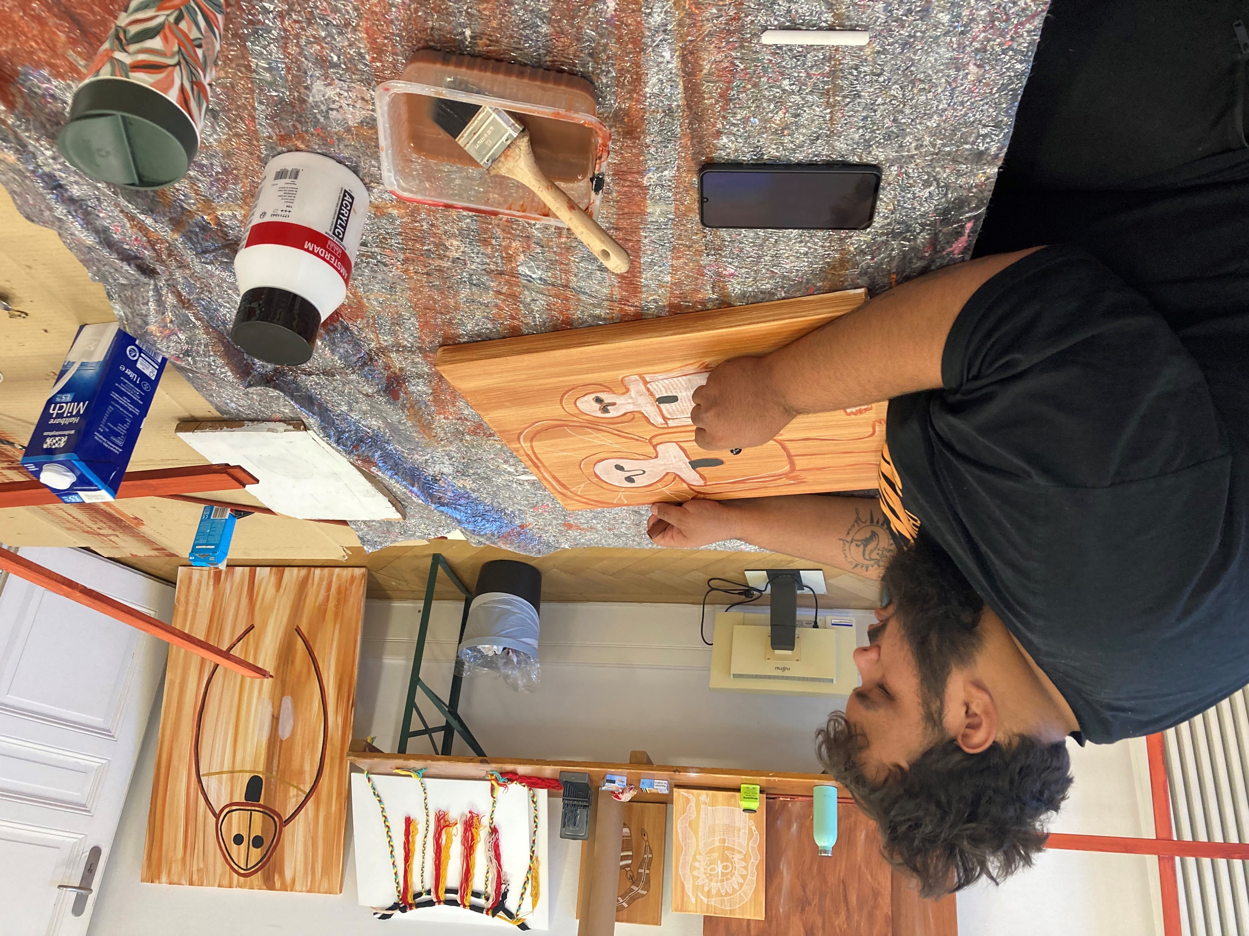 The exhibition project focuses on the Frobenius Institute's historical expedition to the Kimberley region of north-west Australia in 1938/39 and the relevance that the materials collected there have for Indigenous communities today. During the three-week residency in Frankfurt, Indigenous perspectives on the expedition were discussed and new artworks were created in dialogue with the collections of both the Frobenius Institute and the Weltkulturen Museum. The new works were acquired by the museum and will be on display in the collaboratively curated exhibition 'Country bin pull'em' from November 2024.